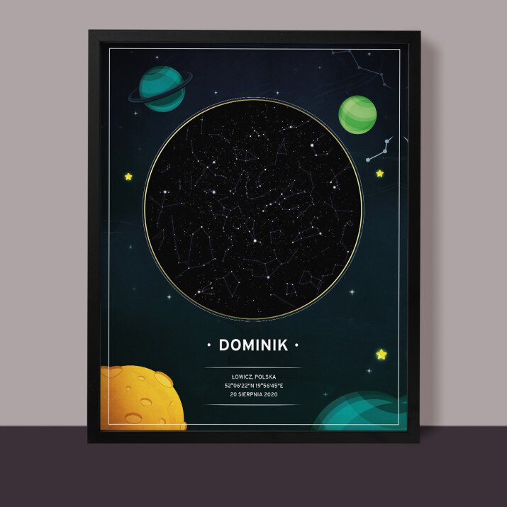 Wyjątkowy plakat w ramce lub obraz na płótnie to piękna i oryginalna pamiątka ważnego dla Ciebie momentu. Podanie wybranego miasta i daty pozwala odtworzyć wygląd nieba i układ gwiazd z tego dnia. Personalizacja obejmuje także podane przez Ciebie imiona, dedykację i inne elementy, dzięki którym taki wydruk stanie się bardzo osobistym i niepowtarzalnym podarunkiem.PERSONALIZACJA