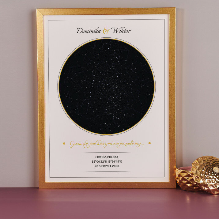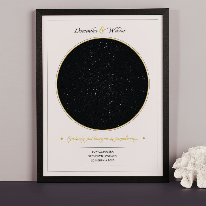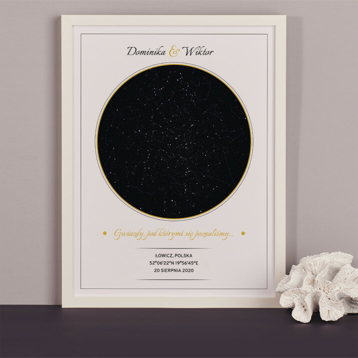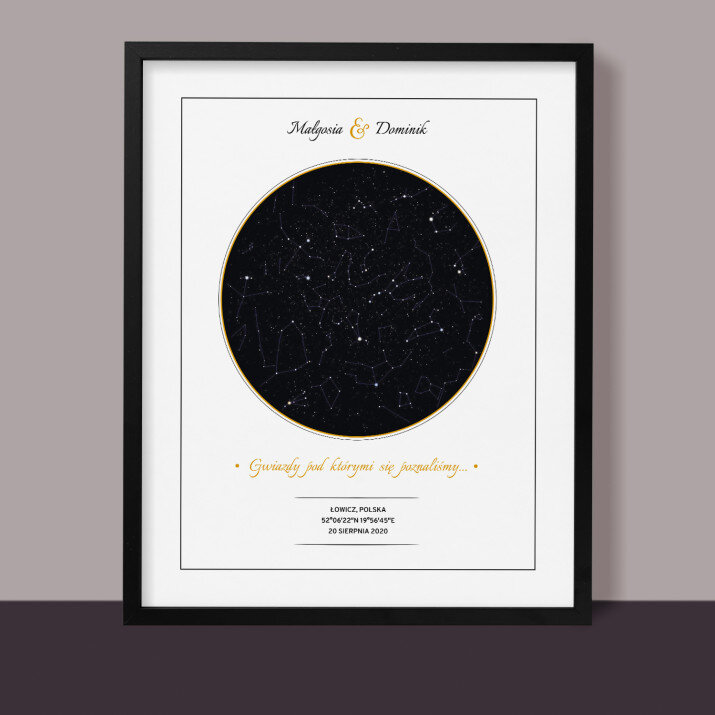 Wyjątkowy plakat w ramce lub obraz na płótnie to piękna i oryginalna pamiątka ważnego dla Ciebie momentu. Podanie wybranego miasta i daty pozwala odtworzyć wygląd nieba i układ gwiazd z tego dnia. Personalizacja obejmuje także podane przez Ciebie imiona, dedykację i inne elementy, dzięki którym taki wydruk stanie się bardzo osobistym i niepowtarzalnym podarunkiem.PERSONALIZACJA