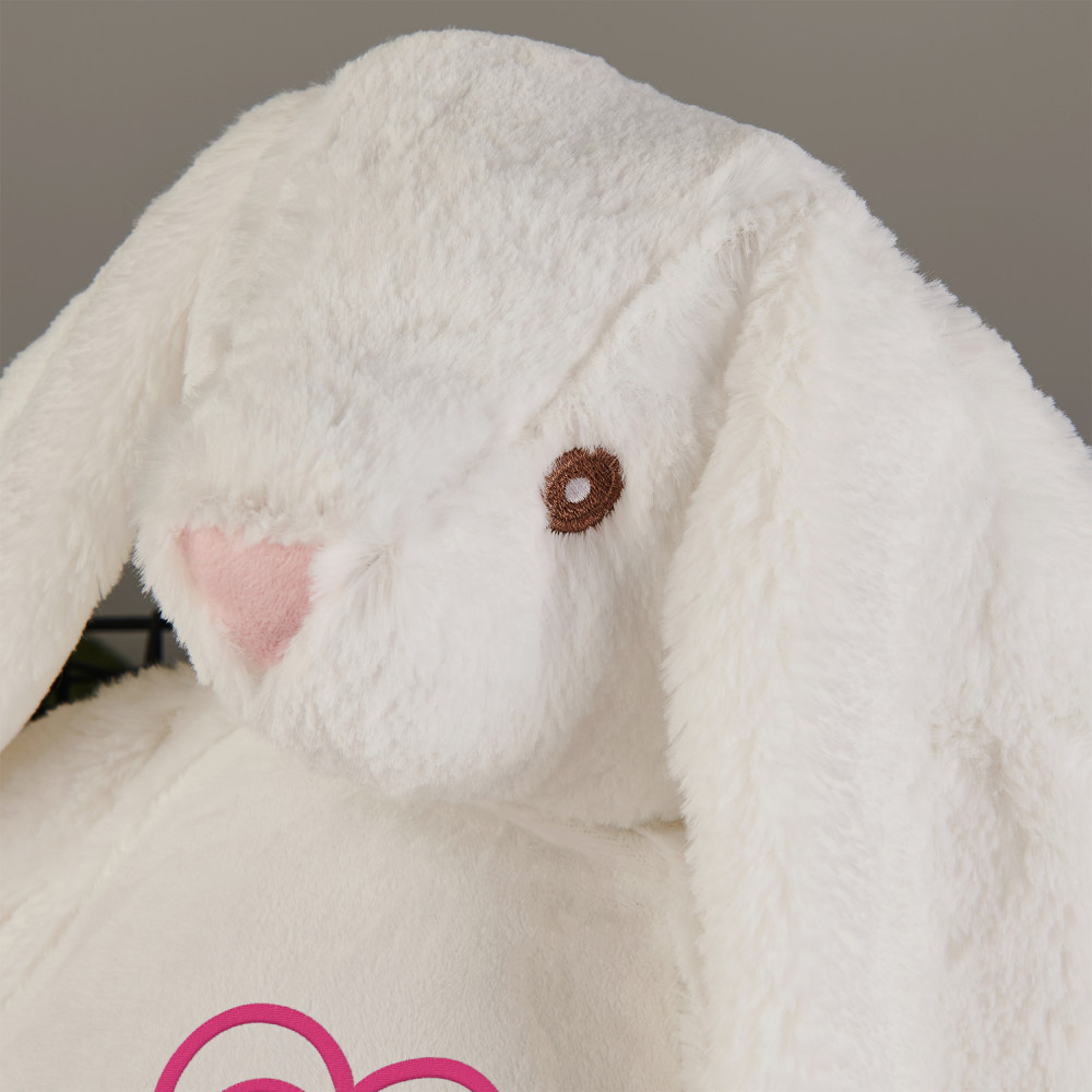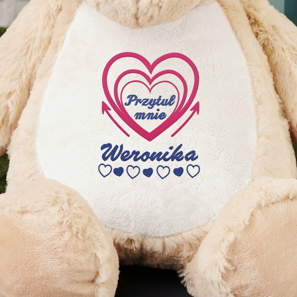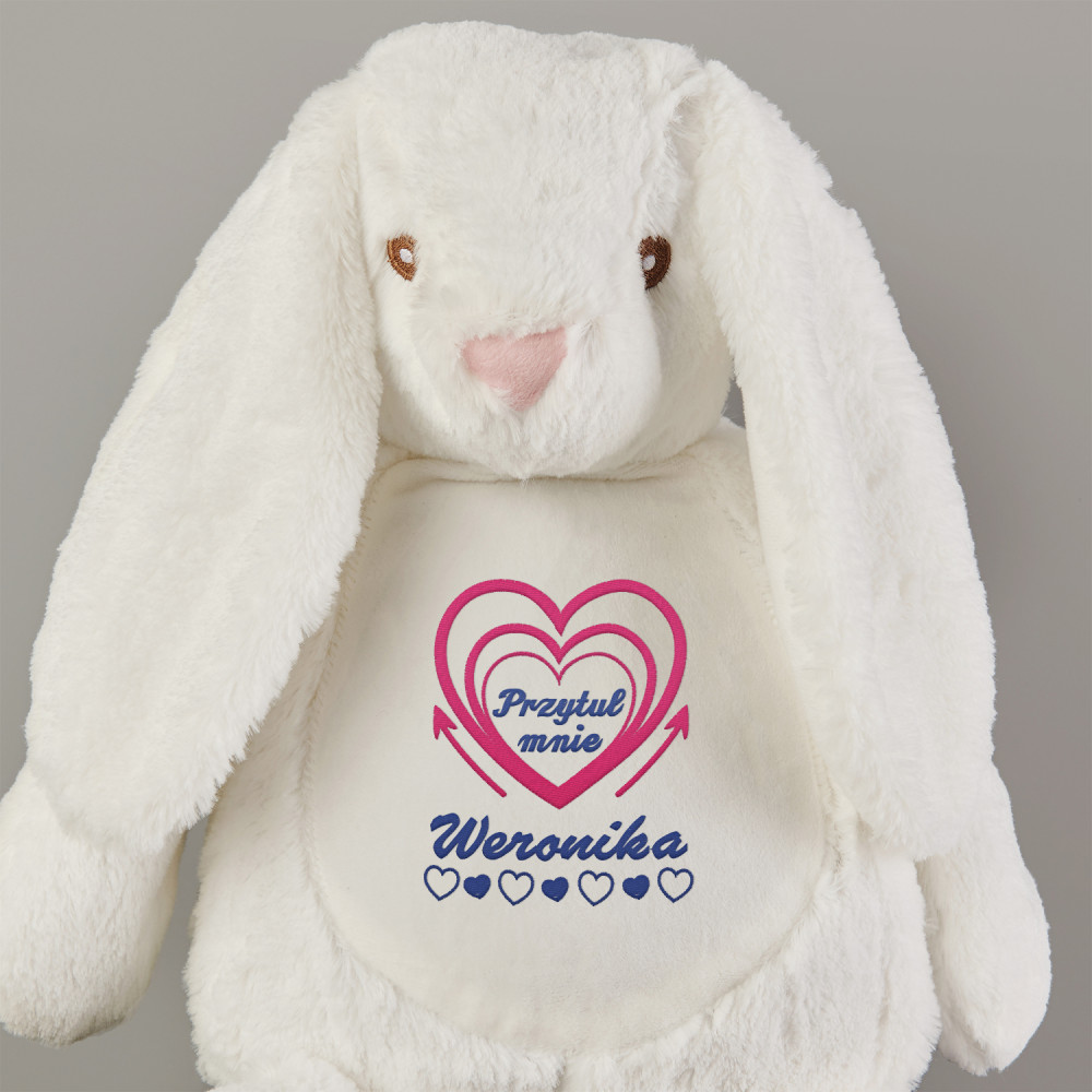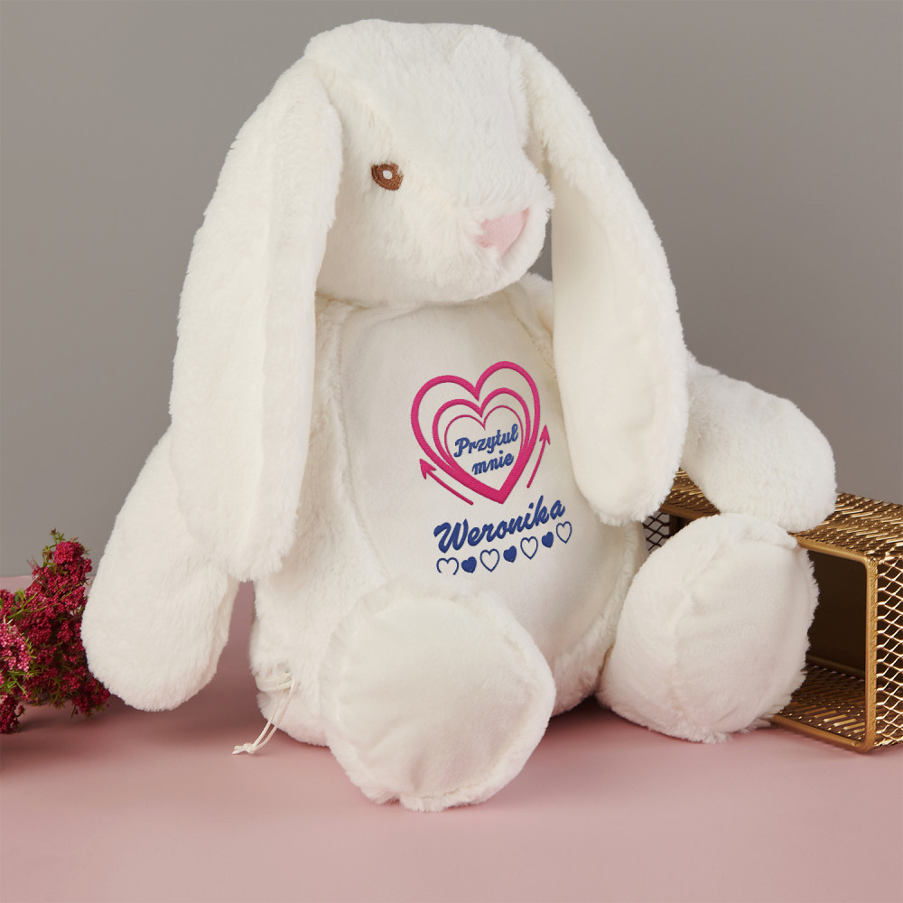 Duży i niezwykle miękki pluszak miś albo królik, ozdobiony jednym z naszych personalizowanych haftowanych wzorów. Zabawka pluszowa, skład: 100% poliester. Maskotka posiada unikalny zamek błyskawiczny, który umożliwia wyjęcie wnętrza i bezproblemowe czyszczenie. Miś jest bezpieczny dla dzieci w każdym wieku. Tylko pranie ręczne. Wysokość pluszaka: 45 cm.