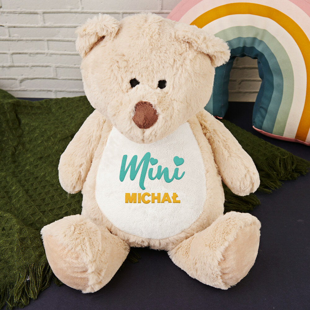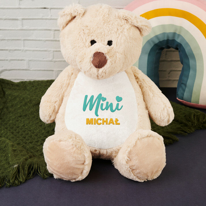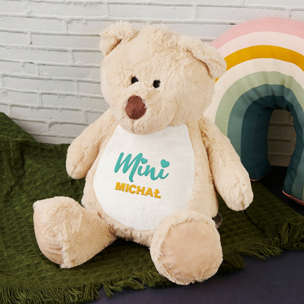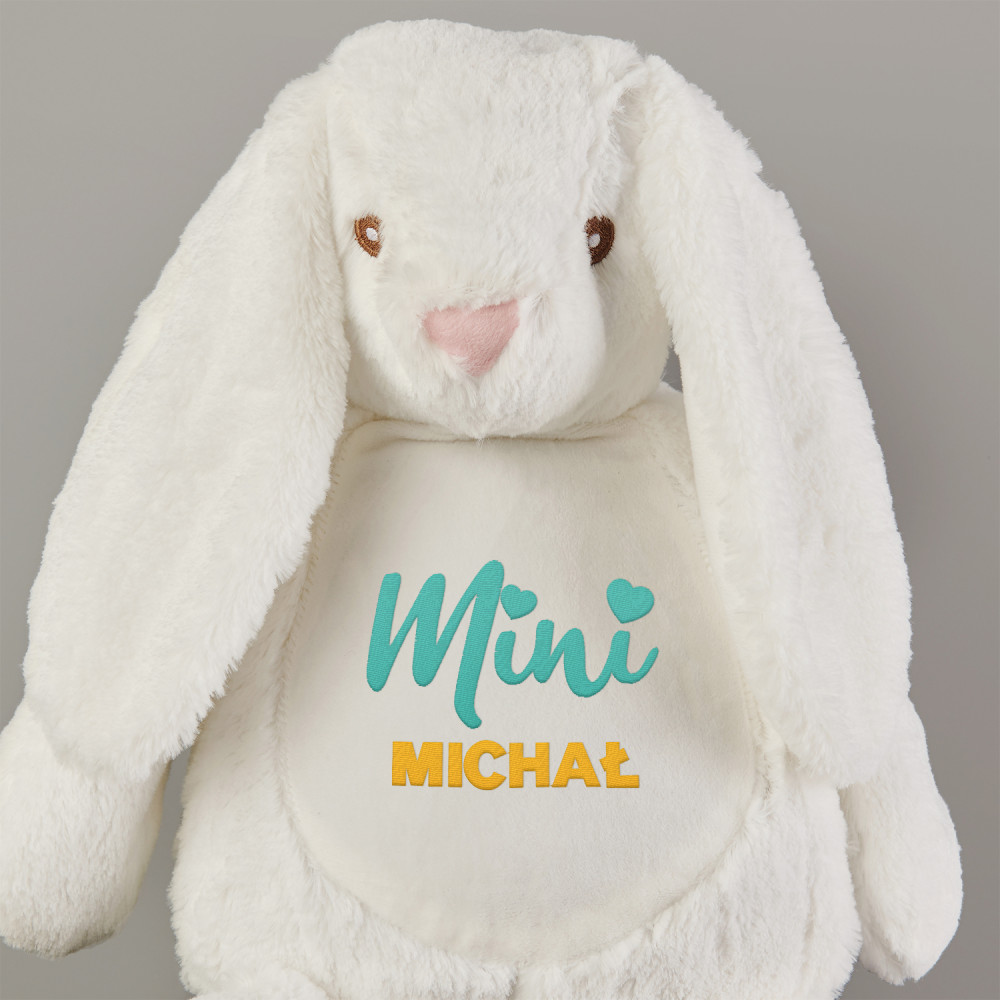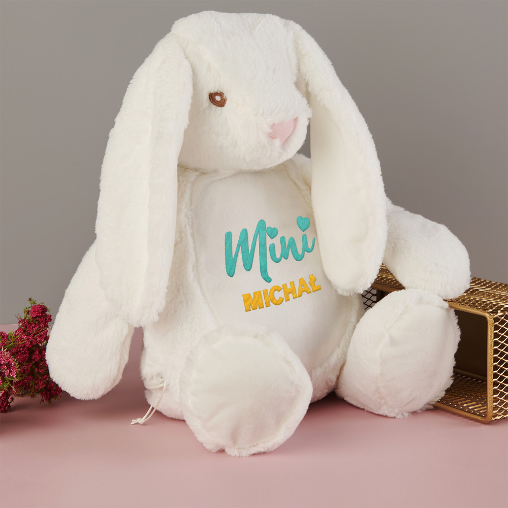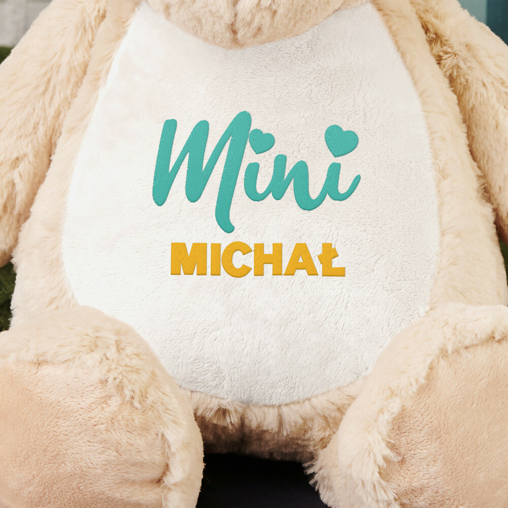 Duży i niezwykle miękki pluszak miś albo królik, ozdobiony jednym z naszych personalizowanych haftowanych wzorów. Zabawka pluszowa, skład: 100% poliester. Maskotka posiada unikalny zamek błyskawiczny, który umożliwia wyjęcie wnętrza i bezproblemowe czyszczenie. Miś jest bezpieczny dla dzieci w każdym wieku. Tylko pranie ręczne. Wysokość pluszaka: 45 cm.