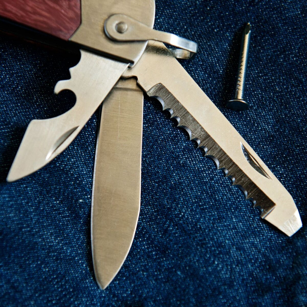 Narzędzie wielofunkcyjne o wymiarach 136x72x20 mm(gdy jest złożone)zostało wykonane z połączenia solidnego metalu i wyszukanego drewna. Tradycyjne kombinerki kształtem dodatkowo pełnią funkcję młotka. Wszystkie funkcje narzędzia to: