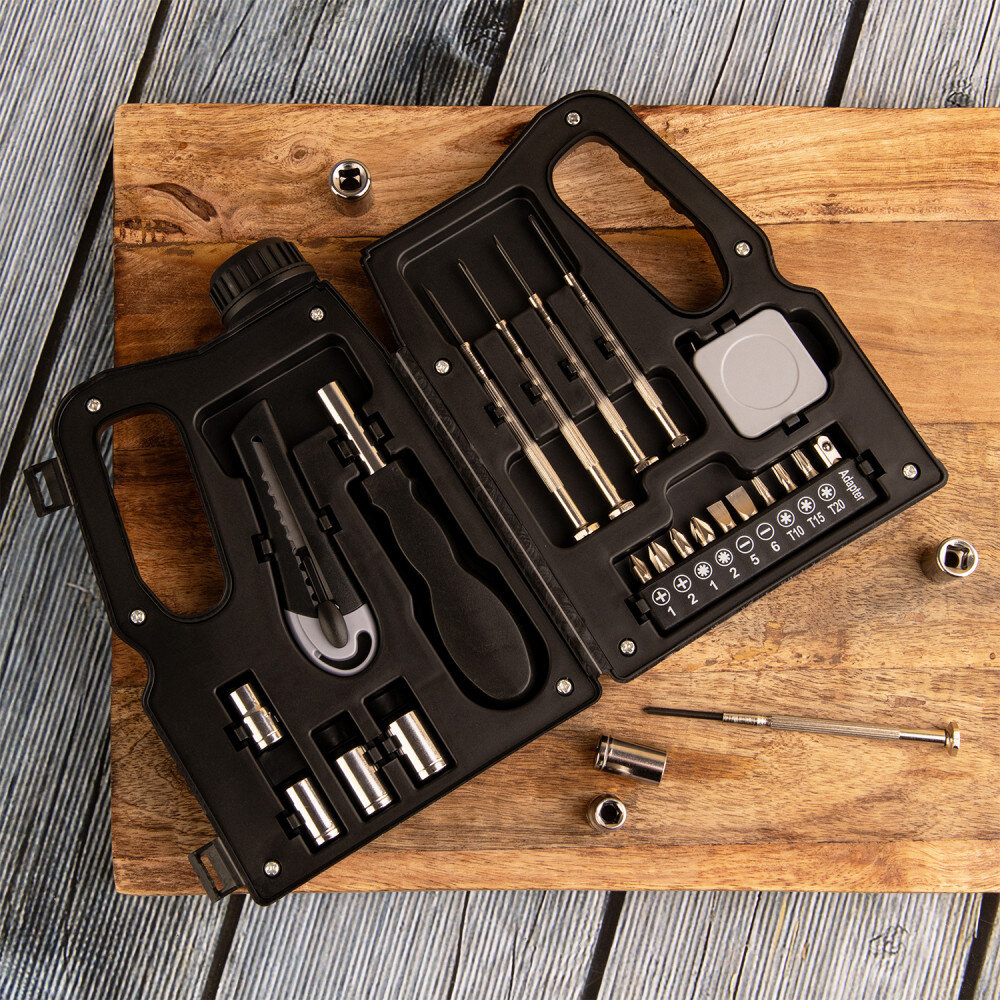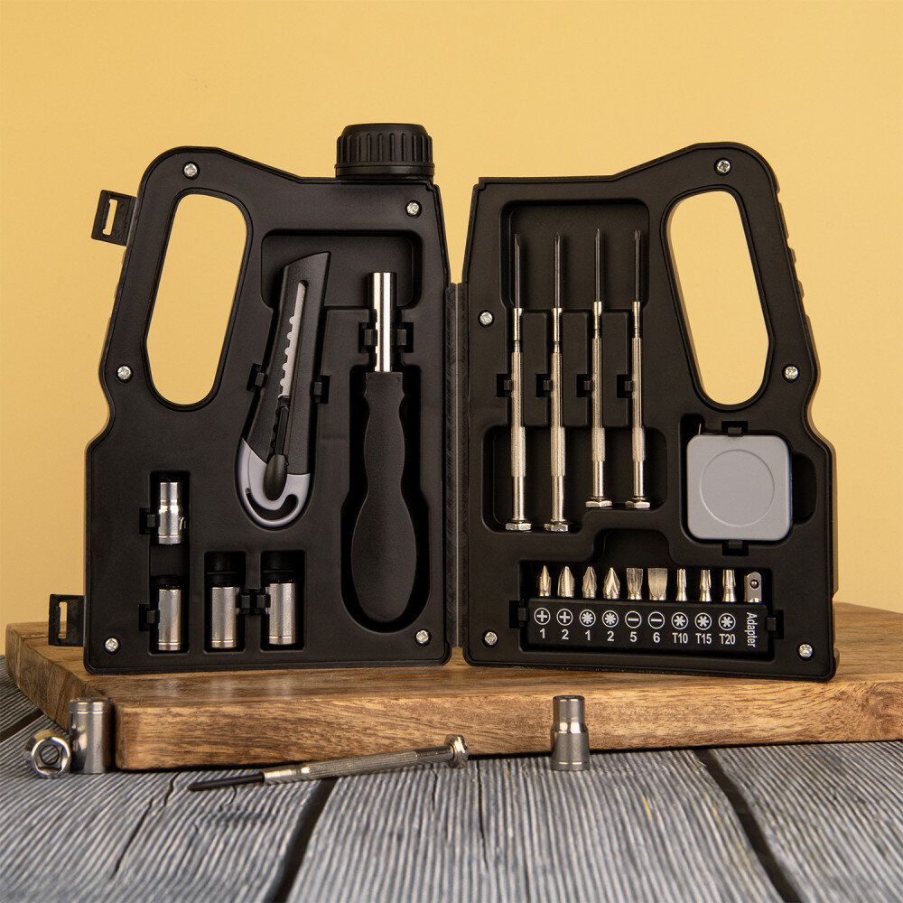 Pomysłowy prezent dla złotej rączki! Zestaw narzędzi w etui w kształcie kanistra to zdecydowanie niestandardowa i oryginalna forma upominku. W zestawie znajdują się niezwykle przydatne narzędzia: cztery śrubokręty precyzyjne, nożyk do tapet, zwijana miara, uchwyt, cztery klucze nasadkowe z przejściówką i 9 bitów. Z pewnością każdy majsterkowicz (i nie tylko) będzie zachwycony takim podarunkiem!