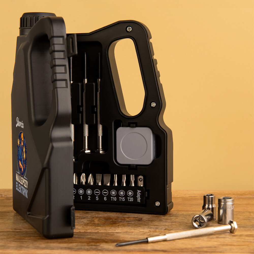 Pomysłowy prezent dla złotej rączki! Zestaw narzędzi w etui w kształcie kanistra to zdecydowanie niestandardowa i oryginalna forma upominku. W zestawie znajdują się niezwykle przydatne narzędzia: cztery śrubokręty precyzyjne, nożyk do tapet, zwijana miara, uchwyt, cztery klucze nasadkowe z przejściówką i 9 bitów. Z pewnością każdy majsterkowicz (i nie tylko) będzie zachwycony takim podarunkiem!