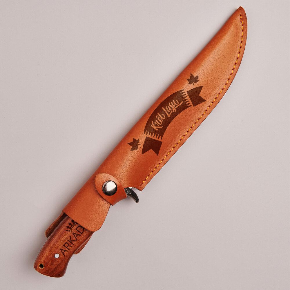 nigdy nas nie zawiedzie i sprawdzi się w każdych warunkach. Nóż posiada drewnianą rękojeść w kolorze brązowym oraz dopasowane, eleganckie etui wykonane z