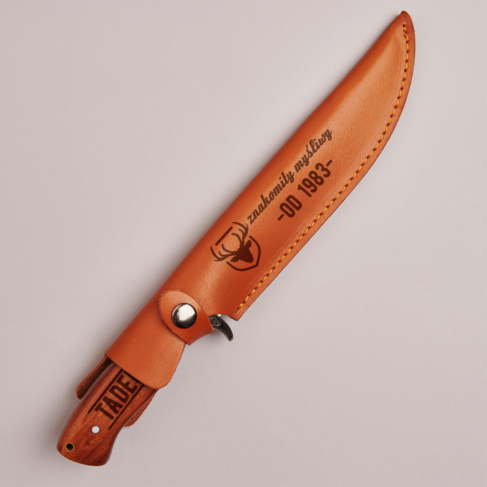 nigdy nas nie zawiedzie i sprawdzi się w każdych warunkach. Nóż posiada drewnianą rękojeść w kolorze brązowym oraz dopasowane, eleganckie etui wykonane z