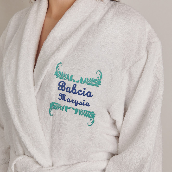 Uniwersalny szlafrok w kolorze białym, wykonany ze 100% bawełny frotte. Wygodny, ładny, mięciutki - zapewni doskonały komfort, gdy wszystkie troski dnia odejdą w dal i nadejdzie czas na relaks. Ogrzeje również zaspane ciałko zaraz po przebudzeniu. Szlafrok ozdobiony jest personalizowanym haftem, który pięknie wygląda, poprawia samopoczucie i zamienia produkt w wyjątkowy upominek!Szlafrok ma elegancki fason z kołnierzykiem i kieszeniami, aby można było zabłysnąć na wieczornym pokazie mody podomowej. Rozmiar szlafroka uniwersalny, gramatura 350 g/m2. Unisex.