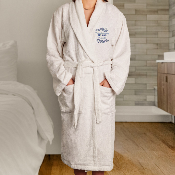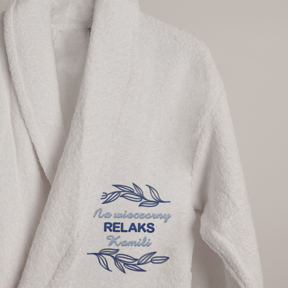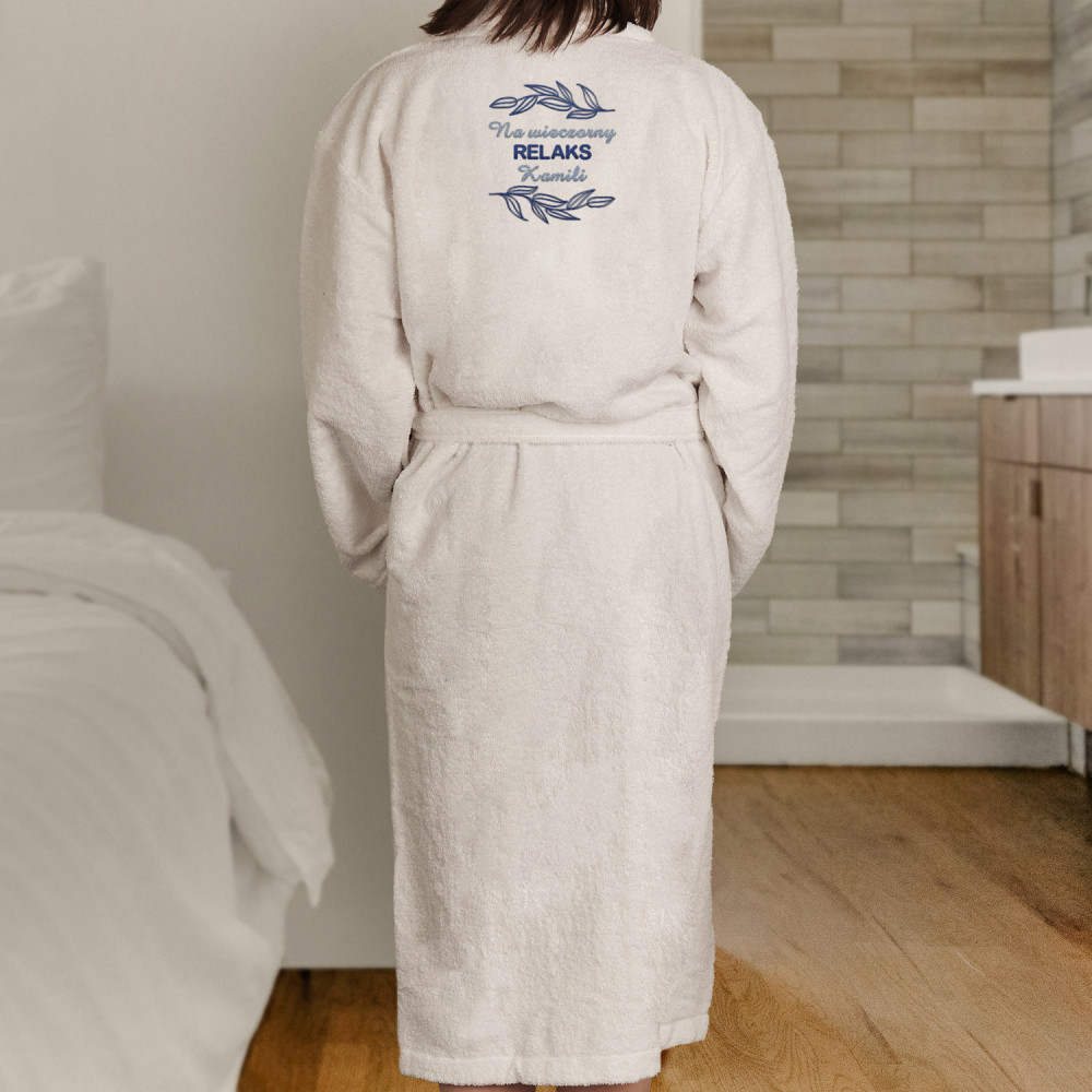 Uniwersalny szlafrok w kolorze białym, wykonany ze 100% bawełny frotte. Wygodny, ładny, mięciutki - zapewni doskonały komfort, gdy wszystkie troski dnia odejdą w dal i nadejdzie czas na relaks. Ogrzeje również zaspane ciałko zaraz po przebudzeniu. Szlafrok ozdobiony jest personalizowanym haftem, który pięknie wygląda, poprawia samopoczucie i zamienia produkt w wyjątkowy upominek!Szlafrok ma elegancki fason z kołnierzykiem i kieszeniami, aby można było zabłysnąć na wieczornym pokazie mody podomowej. Rozmiar szlafroka uniwersalny, gramatura 350 g/m2. Unisex.
