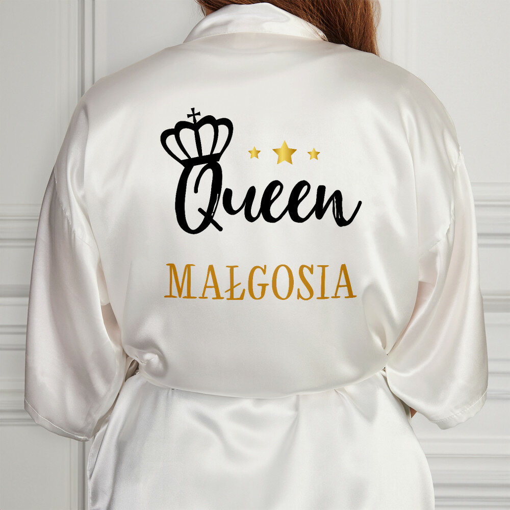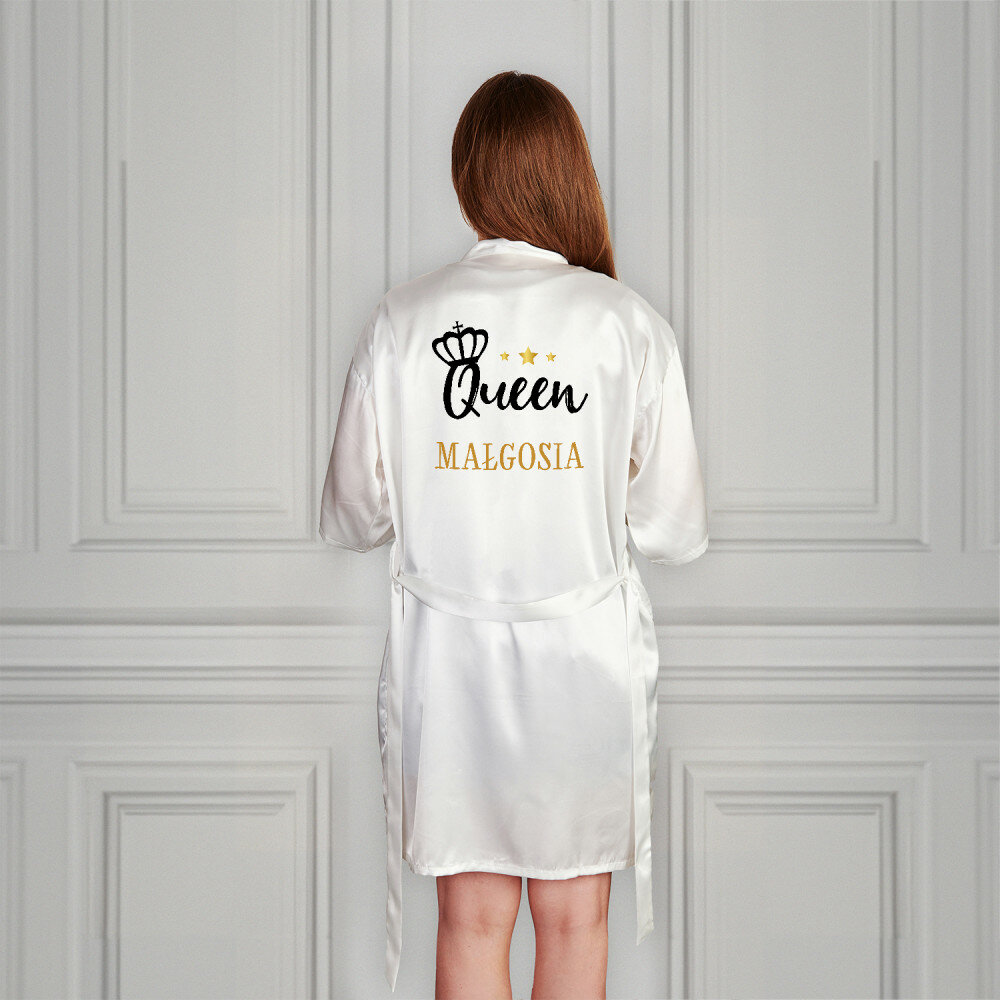 Satynowy szlafrok w kolorze białym to świetny upominek na wiele okazji! Sprawdzi się idealnie w trakcie przygotowań panny młodej, na imprezie urodzinowej i w wielu innych sytuacjach. Doskonały również na co dzień! Możesz go podarować bliskiej osobie w prezencie albo kupić go dla siebie i swojego niezawodnego teamu! Szlafrok jest dostępny w 3 rozmiarach, ma dołączony pasek i przyszyte do materiału szlufki. Tkanina jest przyjemna w dotyku, a jej połyskujące wykończenie zapewnia elegancki wygląd. Dodatkowo na szlafroku wykonamy personalizowany nadruk, dzięki czemu będzie się niesamowicie prezentować zarówno na żywo, jak i na zdjęciach!Skład: poliester 95%, elastan 5%
