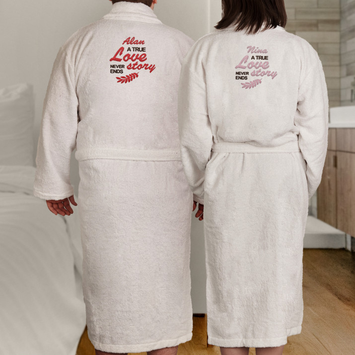 Dwa uniwersalne szlafroki w kolorze białym, wykonane ze 100% bawełny frotte. Wygodne, ładne, mięciutkie - zapewnią doskonały komfort, gdy wszystkie troski dnia odejdą w dal i nadejdzie czas na relaks. Ogrzeją również zaspane ciałka zaraz po przebudzeniu. Szlafroki ozdobione są personalizowanymi haftami, które pięknie wyglądają, poprawiają samopoczucie i zamieniają produkt w wyjątkowy upominek!Każdy szlafrok ma elegancki fason z kołnierzykiem i kieszeniami, aby można było zabłysnąć na wieczornym pokazie mody podomowej. Rozmiar szlafroka uniwersalny, gramatura 350 g/m2. Unisex.