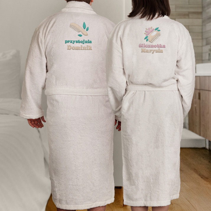 Dwa uniwersalne szlafroki w kolorze białym, wykonane ze 100% bawełny frotte. Wygodne, ładne, mięciutkie - zapewnią doskonały komfort, gdy wszystkie troski dnia odejdą w dal i nadejdzie czas na relaks. Ogrzeją również zaspane ciałka zaraz po przebudzeniu. Szlafroki ozdobione są personalizowanymi haftami, które pięknie wyglądają, poprawiają samopoczucie i zamieniają produkt w wyjątkowy upominek!