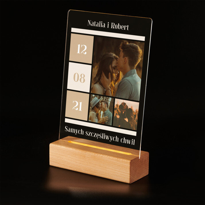 Wyjątkowa pamiątka, która zachwyci obdarowaną osobę! Wydruk na bezbarwnym szkle akrylowym (pleksiglas) o grubości 3 mm to upominek na lata. Materiał wyróżnia się doskonałą jakością powierzchni i sztywnością, jest odporny na uszkodzenia oraz warunki atmosferyczne.Podstawka LED wykonana jest z drewna bukowego. Temperatura barwowa 3000K zapewnia ciepłe, nastrojowe światło, dzięki któremu personalizowana pamiątka będzie wyglądać niczym najpiękniejszy skarb. Gwarantujemy, że będzie to świetna niespodzianka dla Twoich bliskich!